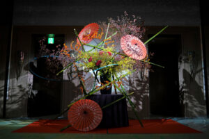 また和傘を大きな花に見立てて3輪生けることで日本の抒情性を表出し、